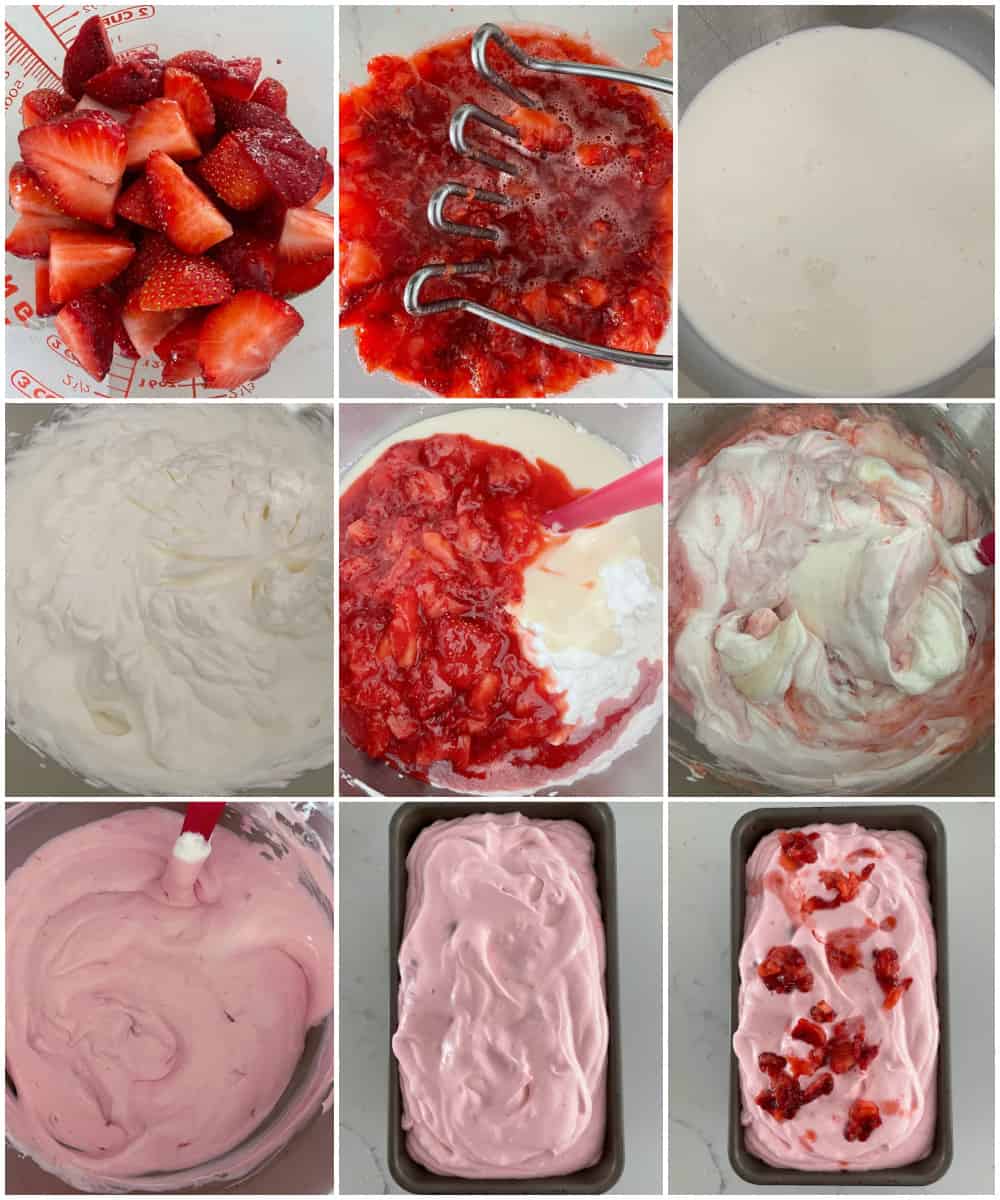 - Only 3 main ingredients are used, whipping cream, sweetened condensed milk and fresh strawberries.