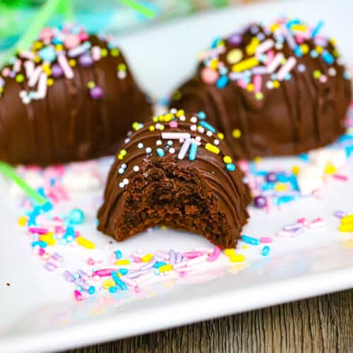 Oh my sweet friends, these Easter Brownie Truffle Eggs are calling your name! Soft, fudgy brownie centers mixed with rich chocolate frosting, shaped into adorable little eggs, and dipped in smooth melted chocolate with drizzles and sprinkles on top?! These are basically brownie truffles all dressed up for Easter and they are absolutely irresistible! Plus they start with a boxed brownie mix so they come together SO fast.
