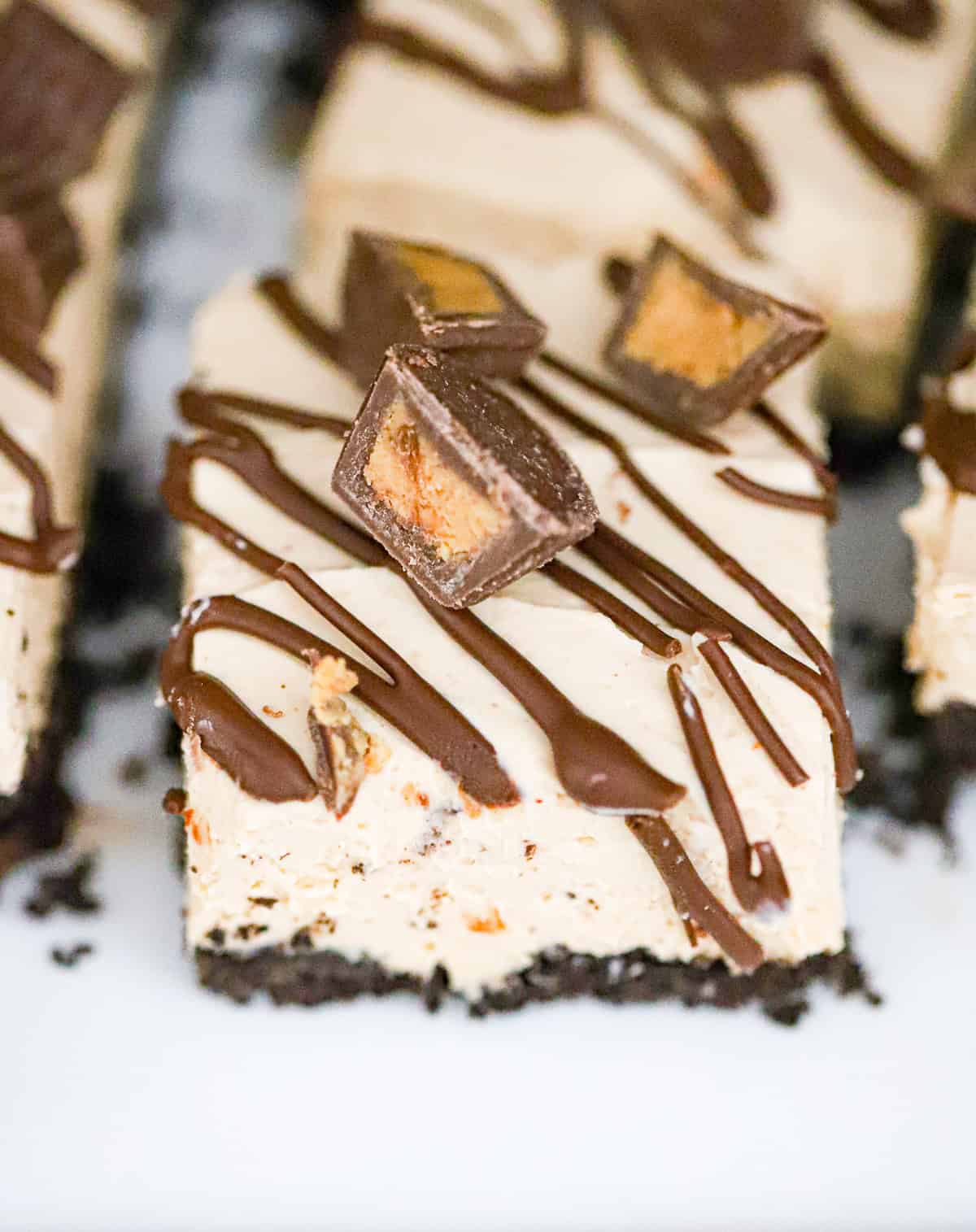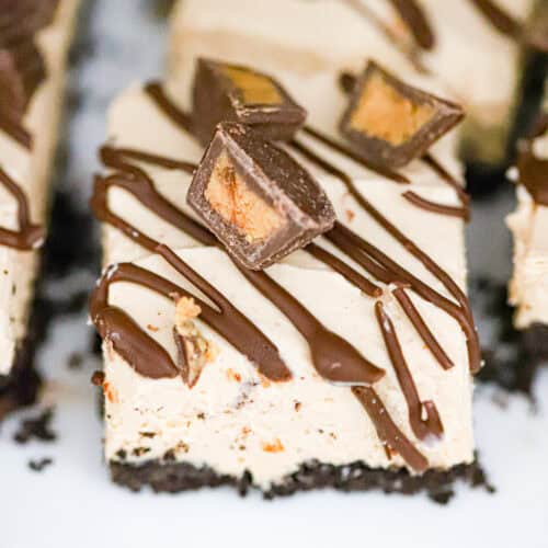 Thick, creamy no-bake peanut butter cup cheesecake bars loaded with protein. Made in a 9x5 loaf pan with a chocolate cookie crust, peanut butter protein filling, and topped with melted chocolate and chopped peanut butter cups. 14 to 20g protein per slice!